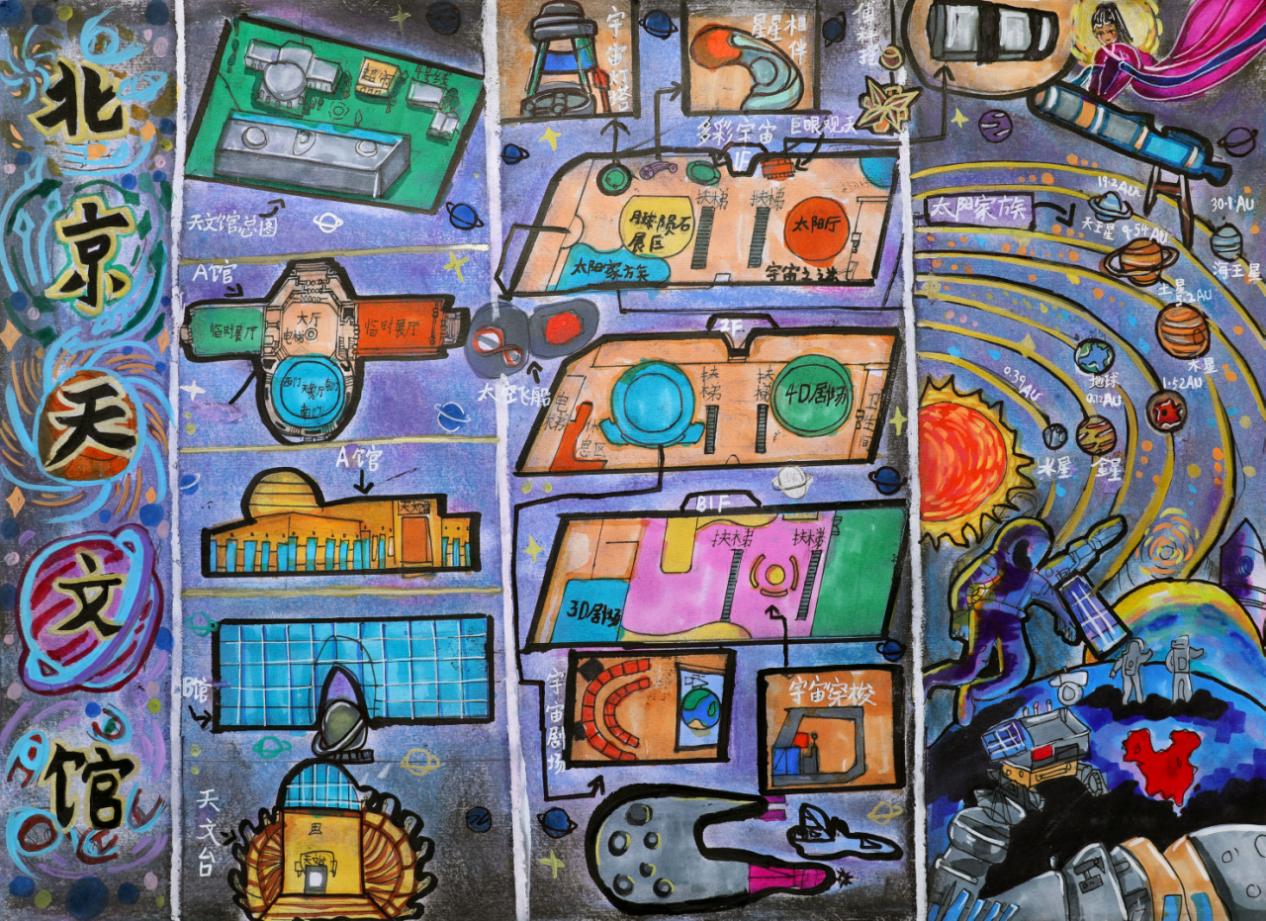 活动中评选出科创地图优秀设计作品151项,科创地图创意设计作品420项,科创地图探索设计作品598项,涵盖小学、初中、高中各学段。这些作品或是绘制科创场馆内科普教育场景的单馆地图,或是以不同主题串起北京区域内若干场馆的多馆地图。学生们将宏大的科技主题与复杂的场馆空间,凝练在一张画纸上,展现了通过亲身走进科创场馆,了解首都科技创新的辉煌成就、重大成果背后的奋斗故事以及科学家精神后的收获与成长。