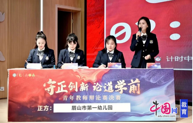 决赛现场,眉山市第一幼儿园代表队围绕“幼儿冲突解决”这一实践性辩题,与成都市金牛区机关第三幼儿园展开激烈交锋。辩手们凭借扎实的理论功底、生动的实践案例与清晰的逻辑论证,展现了眉山幼教人的专业素养与思辨风采。